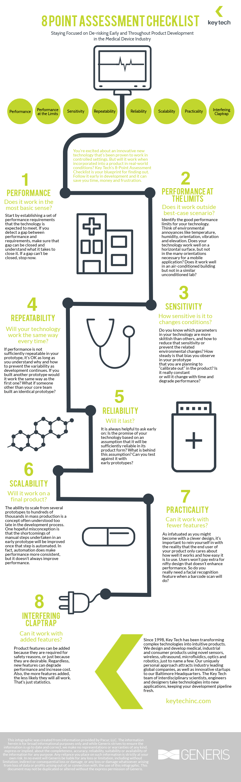 Sample in, results out. These customers have premium assays that are very challenging to automate, requiring custom components. An example is GenMark’s ePlex, developed in partnership with Key Tech. Key Tech applies a de-risking, scientific method approach to challenging assay automation projects to determine the optimal architecture of their very complex diagnostic system. This could be a POCT diagnostic developed around a complex cartridge and instrument. It is a complex assay that requires many automated steps and is worth the investment in a custom diagnostic cartridge or a more complex instrument, because of the premium provided in sensitivity and specificity, or perhaps the broad assay menu the system can support. For these customers, we follow Key Tech’s De-Risking Approach to characterize the assay, study the governing variables of interest, then define the optimal architecture. Below is an image of this approach: