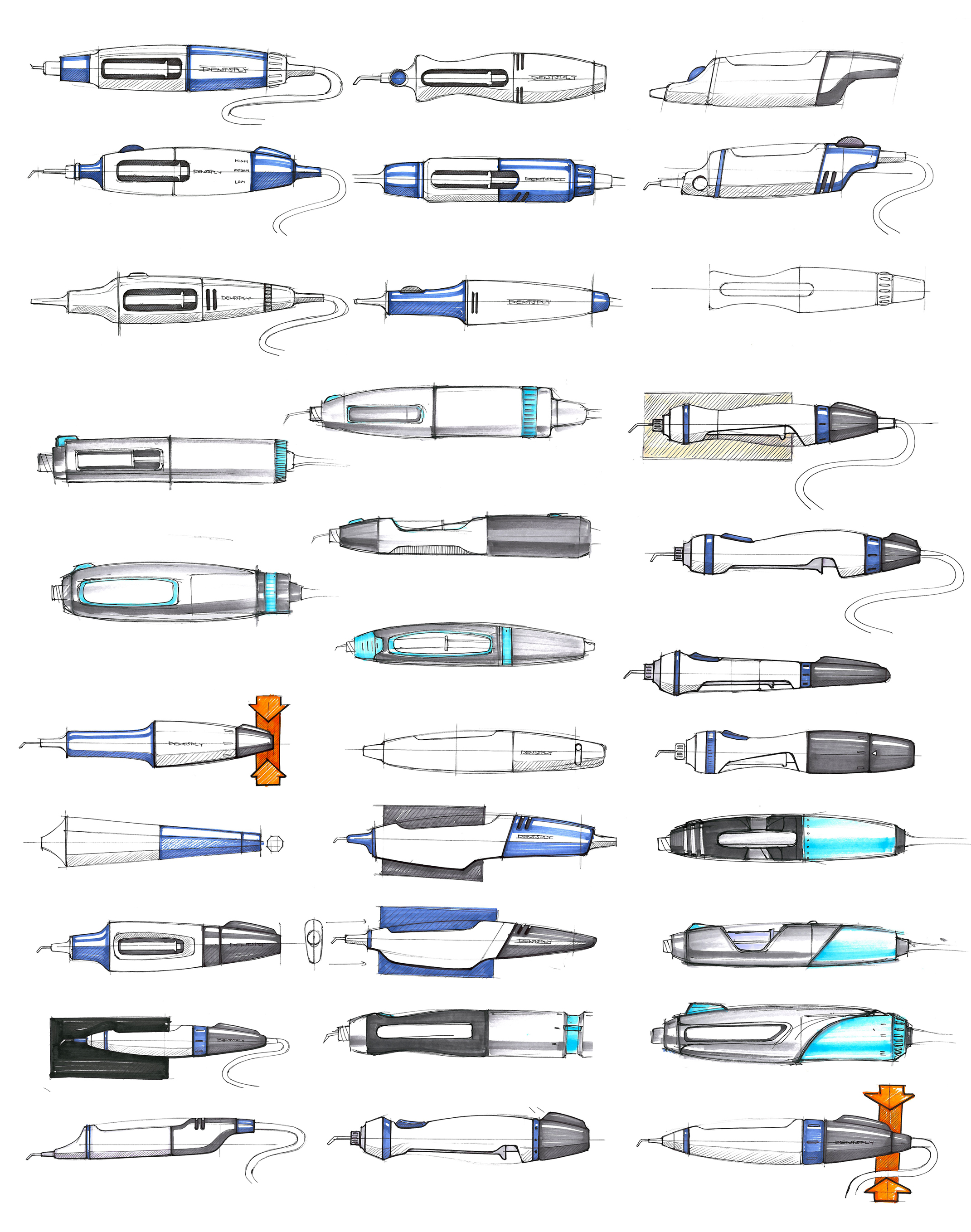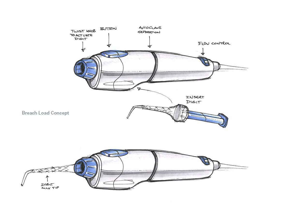 The Digit Power dispenser is an impression material delivery device that connects to a dentist’s chair and it allows them to dispense directly and precisely into the impression site. Key Tech designed the hand piece that the clinician holds during the procedure as well as the disposable cap. User studies were performed at dental clinics to understand user needs and document the use cases. Then, early concept sketches and foam mockups were created to evaluate the different design paths. Once a concept was defined, then preliminary solid modeling was completed before transferring the design back to Dentsply for manufacturing. This product was selected for a 2014 MDEA Design award.