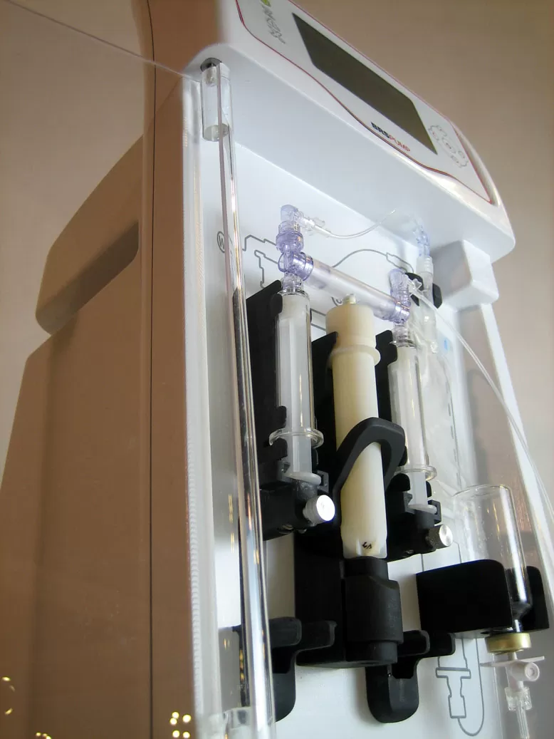 A worldwide healthcare company focusing on innovative devices and pharmaceuticals developed a therapeutic requiring removal of a transfer buffer prior to infusion. Key Tech was engaged to design and verify a syringe-driver-based system that would remove the transfer buffer without damaging the therapeutic. Starting with a system requirements set, Key Tech developed all aspects of the design: the user interface, hardware and embedded firmware for ease of use and compliance with IEC 60601-1 3rd Edition. The complex durable/disposable interface was managed as well, accommodating disposable design revisions by the client during parallel development. Functional prototypes were delivered for client demonstrations to key opinion leaders to foster commercial interest and solicit design feedback. Separate durable and disposable contract manufacturers delivered V&V units, and Key Tech verified the device, while the client performed user validations.