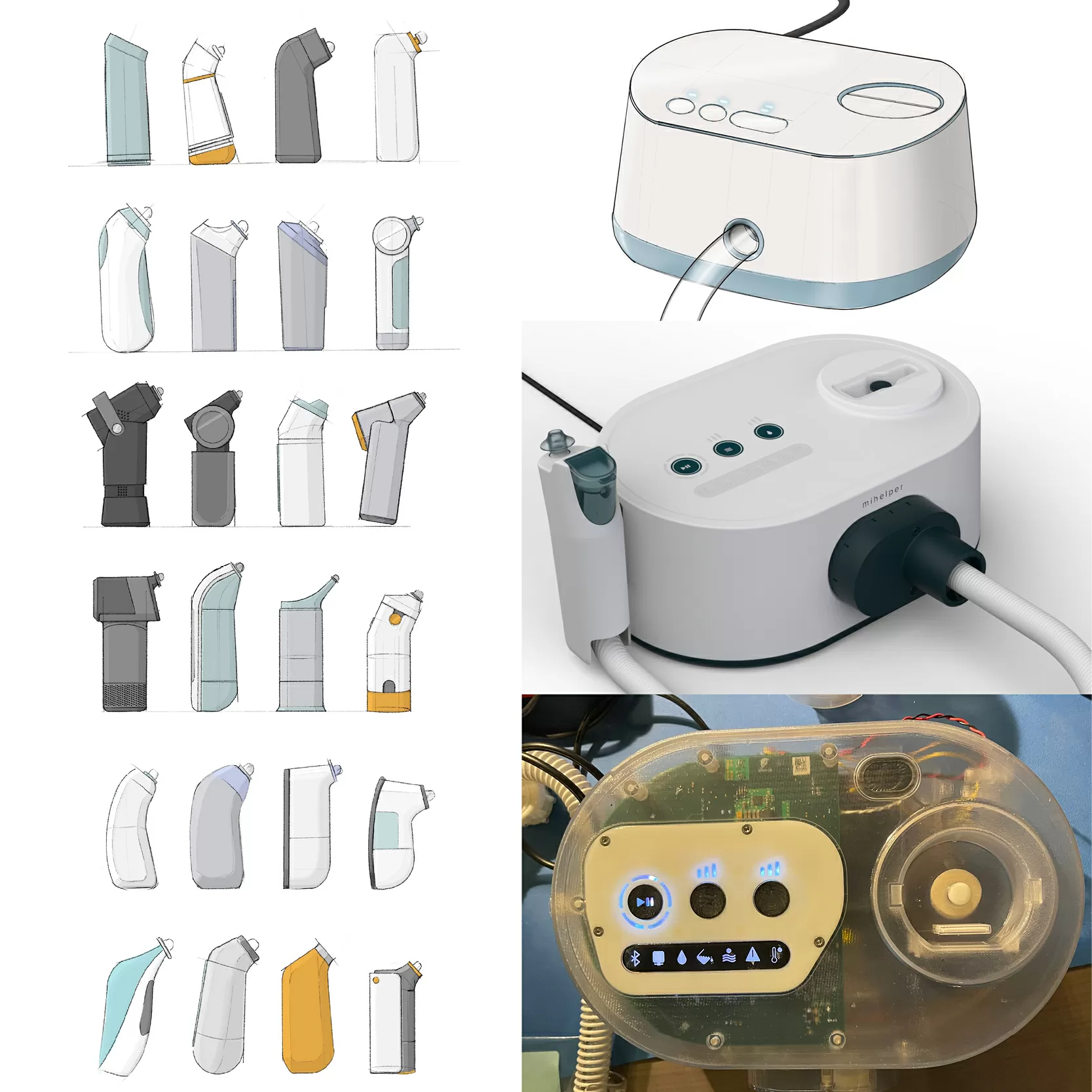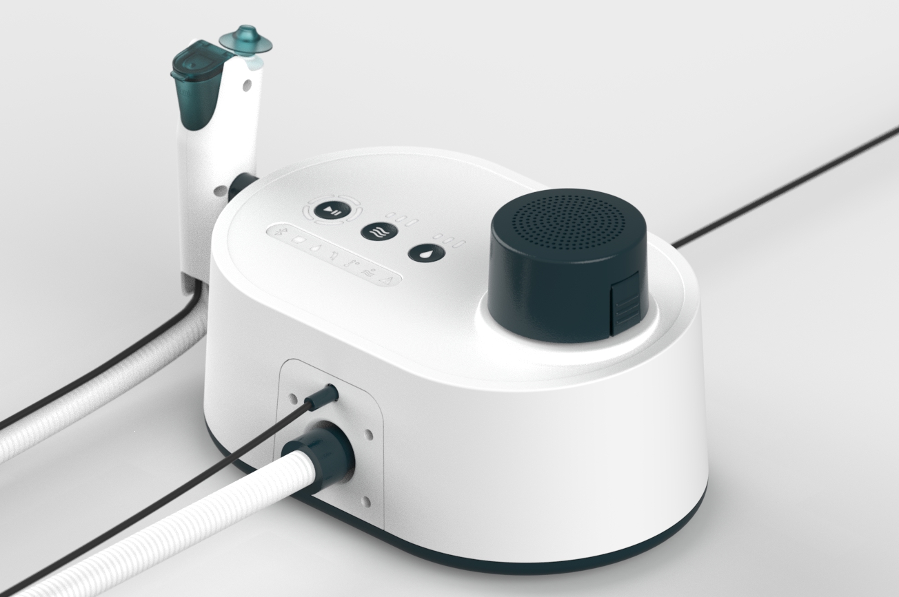 The Mi-HelperTM is a completely new way to manage pain from acute migraine. Using a technique developed at Johns Hopkins, the Mi-Helper is a semi-portable device (similar in size and portability to a standard CPAP) that delivers a specially conditioned air stream to the nasal turbinates, providing stimulation to nerve pathways affecting pain modulation. Key Tech designed both the device and disposable components. The design incorporates mesh ultrasonic misting transducers to generate a saline mist, as well as a heatsink and fan assembly to control the temperature of delivered air. The simple, intuitive user interface and device workflow were designed based on user research which was also conducted by Key Tech.
